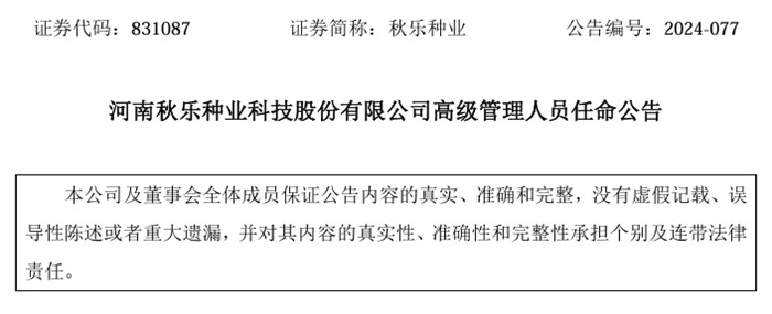 日前,河南秋樂、湖北康樂、河北雙星種業、新疆錦棉種業先后發布任命公告。具體情況如何?一起來看看!