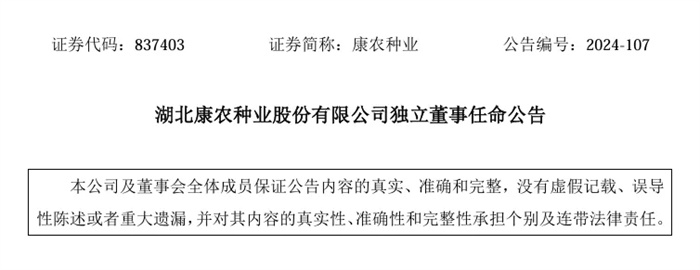 12月16日,湖北康農種業發布公司獨立董事任命公告,同意選舉劉強先生擔任第三屆董事會戰略委員會委員,任期自公司股東大會審議通過之日起至本屆董事會屆滿之日止。