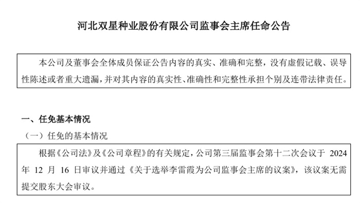 12月16日,河北雙星種業發布監事會主席任命公告,公告稱,根據《公司法》及《公司章程》的有關規定,公司第三屆監事會第十二次會議于 2024 年 12 月 16 日審議并通過《關于選舉李雷霞為公司監事會主席的議案》,該議案無需提交股東大會審議。
