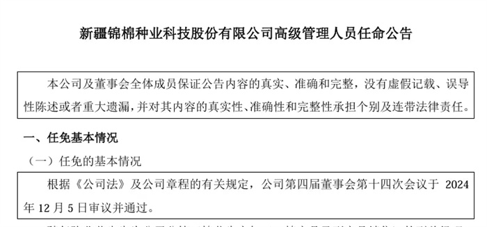 12月9日,新疆錦棉種業發布高級管理人員任命公告,公告稱,根據《公司法》及公司章程的有關規定,公司第四屆董事會第十四次會議于 2024 年12月5日審議并通過。