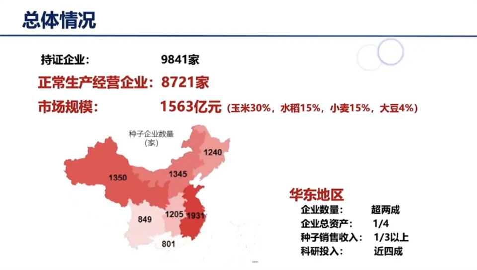 分地區看,華東地區是我國農作物種業最大的優勢區,是種業企業最集中的地區,在華東地區的農作物種業企業數量達1931家,占比超2成,企業總資產占比約1/4,種子銷售收入占比在1/3以上,科研投入占比近4成。
