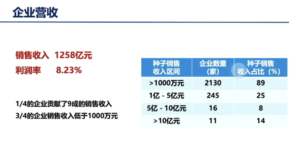 從企業營收看:2023年全國種業企業共實現種子銷售收入1258億元,平均利潤率在8.23%;有3/4企業的銷售收入低于1000萬元;有1/4企業的銷售收入超過 1000萬元,這1/4企業貢獻了全國種業銷售收入的9成。
