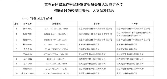 10月8日,中華人民共和國農業農村部公告第830號發布。根據公告,恒豐728D等27個轉基因玉米品種、中聯豆5046等3個轉基因大豆品種,業經第五屆國家農作物品種審定委員會第六次會議審定通過。