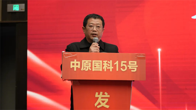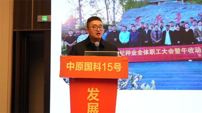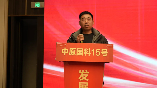 新世紀種業總經理助理兼中原國科15號產品線負責人張寅生向與會嘉賓回顧了公司發展歷程,展示了公司取得的高新技術成果。他說,近年來,公司圍繞小麥重大技術難題開展育種攻關,整合育種資源,創新種質資源,引進山東農業大學、安徽農業大學高水平科研團隊,小麥育種實現了從抗病到高產再到優質強筋、晚播早熟等突破性進展。徽研66在2020年獲得黃淮7省的審定或認定,是安徽省培育的適應范圍最廣的小麥新品種;節水抗旱型品種徽研56是安徽省唯一通過國家級旱地組審定的小麥新品種。公司于2024年通過國家審定的中原國科15號,矮稈大穗大粒,優質高產經過近幾年示范推廣,其優秀的也得了到大家共同見證,農民喜歡,加工企業歡迎。他說,展望未來,希望通過公司已建立較為完善的市場營銷網絡和(he)技(ji)術服務體系,以(yi)“品牌引領、高產(chan)示范、農(nong)技(ji)普及、企戶對接(jie)”的小麥良種推廣模式,攜手大家,同創共贏。