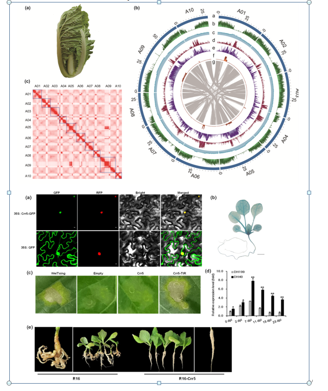 該研究利用游離小孢子培養創制了抗根腫病大白菜DH系DH40,然后利用PacBio HiFi、Hi-C和Illumina HiSeq等技術組裝了染色體水平的基因組。以DH40基因組為參考序列,成功精細定位了抗性基因Crr5,其候選基因DH40A08G013380編碼抗病蛋白,含有典型的TIR-NBS-LRR結構域。序列比較發現Crr5基因序列在感病材料DH199與抗病材料DH40間具有多處差異,最重要的是在第3個外顯子一個T堿基的插入導致了翻譯提前終止。異源表達Crr5使擬南芥具有根腫病抗性,亞細胞定位顯示Crr5定位在細胞核,GUS染色分析表明Crr5在根和葉中均表達,且在根莖結合部位表達量最高,qRT-PCR分析表明Crr5在抗病材料DH40中表達量顯著高于感病材料DH199,功能結構域分析表明Crr5全長不能引起cell death超敏反應,但其TIR結構域可以。最后,還開發了基因特異功能標記Crr5-funK3,以該標記選擇為前景通過標記輔助選擇成功創制了抗根腫病新種質。本研究為白菜類作物的遺傳和基因組學研究提供了寶貴的資源,加深了我們對大白菜根腫病抗性機制的理解,具有重要的理論和實踐意義。