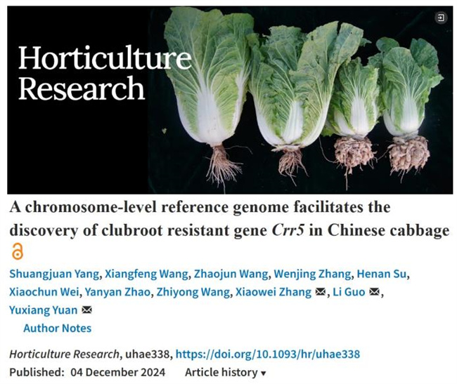 近日,我院蔬菜所張曉偉創新團隊聯合北京大學現代農業研究院郭立團隊在大白菜根腫病抗性基因挖掘與利用研究方面取得新進展,相關研究成果以"A chromosome-level reference genome facilitates the discovery of clubroot resistant gene Crr5 in Chinese cabbage"在園藝學頂級期刊 《Horticulture Research》(中科院1區,Top期刊,IF 7.6)在線發表。