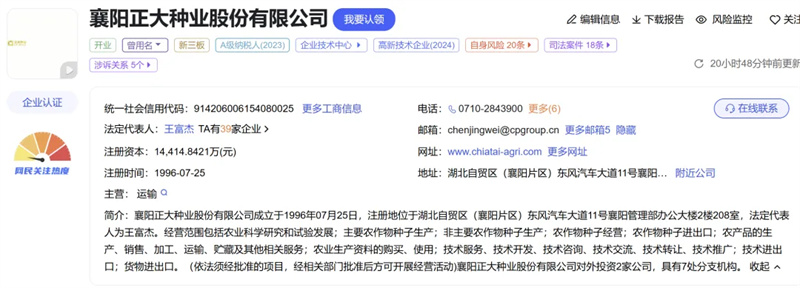 公開信息顯示,正大種業成立于1996年,注冊資本超1.4億元,是一家主要從事種子研發、生產、銷售的種子,目前是中國種業信用骨干企業成員和國家育繁推一體化玉米種業企業。