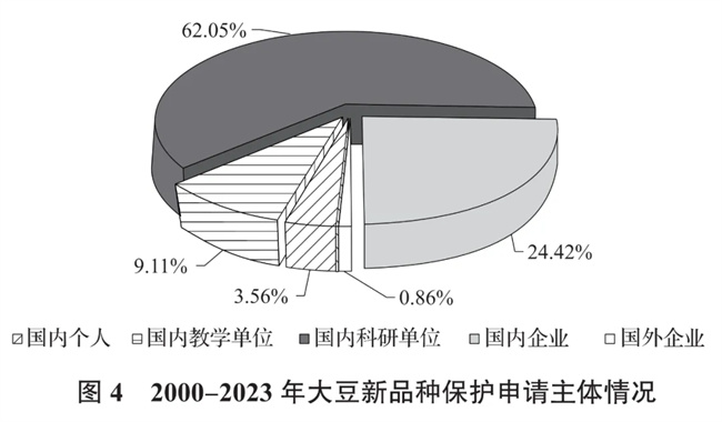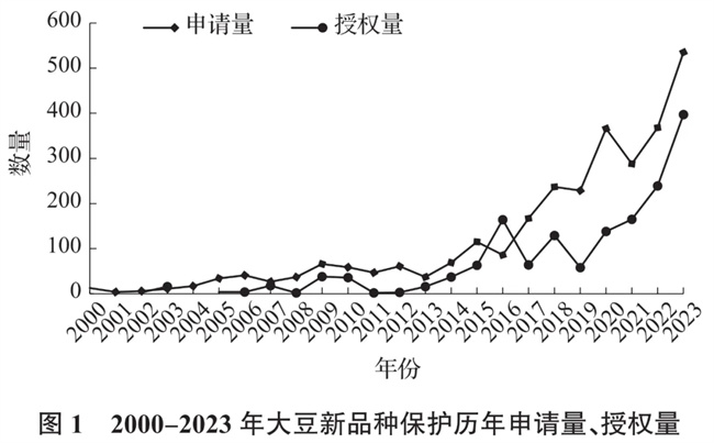 為了減少對進口大豆的依賴,農業農村部決定從2019年起實施大豆振興計劃,提高我國大豆產業質量效益和競爭力,這是大豆產業振興的開端。2022年、2023年連續兩年中央一號文件都提出要提升大豆和油料的產能工程,提高完善大豆生產者補貼。2024年強調繼續實施大豆生產者補貼,鞏固大豆擴種成果,并且要向“高油高產品種”轉型。習近平總書記更是多次強調,要下決心把民族種業搞上去,抓緊培育具有自主知識產權的優良品種,從源頭上保障國家糧食安全。1997年我國頒布了《中華人民共和國植物新品種保護條例》,植物新品種保護制度正式建立,農業農村部累計發布11批農業植物品種保護名錄,其中大豆于2000年被列入第二批農業植物品種保護名錄。截至2023年底,我國農業植物新品種保護總申請量為76914件,其中大豆的申請量為2920件,位列玉米(24845件)、水稻(18038件)和普通小麥(4817件)后的第4位。本文通過分析2000-2023年大豆申請新品種保護情況,并結合相關的政策,分析我國大豆新品種保護發展趨勢。