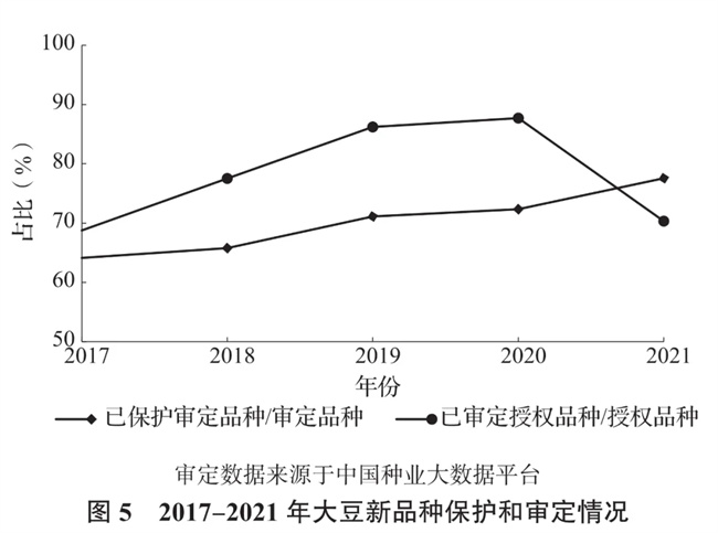 植物新品種保護和品種審定是我國兩種不同的制度,兩者在各自的領域發揮作用,共同推進我國種子產業的發展,但很多大豆新品種即使獲得授權也沒有在田間推廣應用,實際生產中應用率不高。本文對2017-2021年5年間的品種保護和審定數據進行了交互分析(圖5),發現在已授權的品種中,還有一部分品種未通過審定,這可能是為了科研項目等原因而去申請品種保護,并不是為了品種商業化的需要,也可能是培育出的新品種雖然可以授予植物新品種權,但是暫達不到審定的標準,不能進入商業化推廣階段。2017-2020年大豆品種商業化逐漸好轉,授權品種中已審定品種的占比逐漸增加。此外,在已審定的品種中申請新保護品種的占比逐年遞增但仍低于80%,今后需要進一步加強宣傳,提高育種者的新品種保護意識。