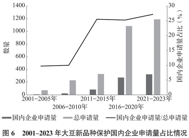 從大豆新品種保護申請主體看,大豆育種主體仍以科研單位為主,企業參與較少,但根據申請趨勢和技術層面分析,未來國內企業申請大豆新品種保護會越來越多。在趨勢方面,以中華人民共和國國民經濟和社會發展五年規劃為時間節點,分析從“十五”至“十四五”期間大豆國內企業申請量、總申請量及國內企業申請量占總申請量的變化趨勢(圖6)。國內企業申請量和總申請量變化均呈上升趨勢,國內企業申請量占總申請量整體呈上升趨勢,其比值由9.72%增加到了27.20%,尤其是“十一五”到“十二五”,占比由10%增加至25.53%,主要原因是2011年出臺了《關于加快推進現代農作物種業發展的意見》,加大了對企業育種的政策扶持力度,鼓勵科技資源向企業流動,建立商業化育種新機制。“十四五”提出全面深化改革,構建高水平社會主義市場經濟體制,2021-2023年“十四五”實施進度已過半,企業占比較2016-2020年增加了1.95%,“十四五”下半場還會激發各類市場主體活力。此外,在技術方面,隨著生物育種技術和雜交制種技術的發展,將會吸引更多企業積極投身于大豆育種的研究中,成為更有活力、創造力和競爭力的申請主體。