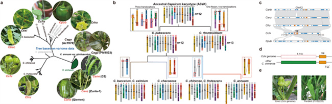 辣椒屬包括5個栽培種和眾多野生種,遺傳多樣性豐富,但演化路線尚不明確。該研究完成了11個辣椒基因組的高質量組裝,2個基因組達到端粒無間隙水平。通過系統發育分析明確了辣椒屬物種的演化關系,重建了辣椒屬具有12對染色體的祖先核型。研究發現,不同辣椒基因組中轉座子爆發事件的差異,不僅導致了大量的結構變異,促進了果實朝向、顏色等性狀的多樣性,還顯著影響了調控元件的動態變化模式,為理解辣椒的基因表達調控變化提供了新視角。另外,研究還基于辣椒核心種質的深度重測序,構建了辣椒群體的單體型圖譜,發現了辣味、病毒抗性等性狀相關單體型片段的漸滲和分化。