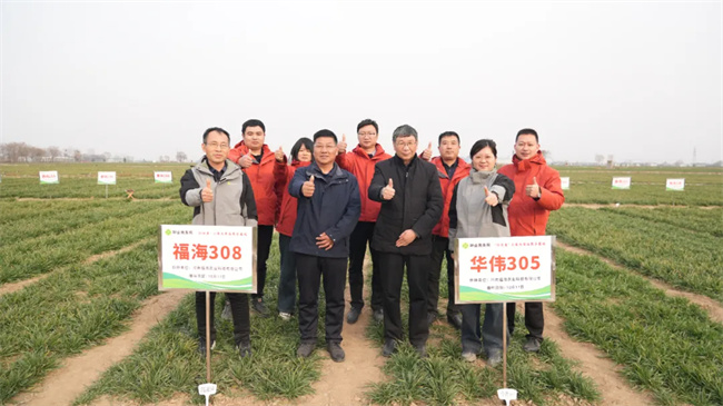 梁文化對公司的核心產品“華偉305”小麥品種的高產穩產、優質強筋及抗逆性強等特點進行全面介紹。他說,華偉305是公司選育的優質強筋小麥品種,于2020年通過國家黃淮麥區南片審定,群體大,成穗率高,高肥水60萬以上,千粒重正常年份55克左右,產量三要素協調。在國家試驗中比對照周麥18增產7.15℅,比百農207增產10.35℅,個別試點增產20℅以上,產量高,增產潛力大;優質強筋,籽粒容重高(平均840克/升),蛋白質含量達15%以上,濕面筋含量超過32%,穩定時間長,適合制作面包、面條等食品。17-18年,18—19年,國家谷物品質檢測,品質指標均達強筋小麥標準,2023年榮獲農業農村部頒發的全國優質強筋小麥金獎;抗逆性強,冬季苗壯,帶綠越冬,抗倒春寒、耐后期高溫,灌漿速度快,適應性強,尤其在黃淮冬麥區表現突出。