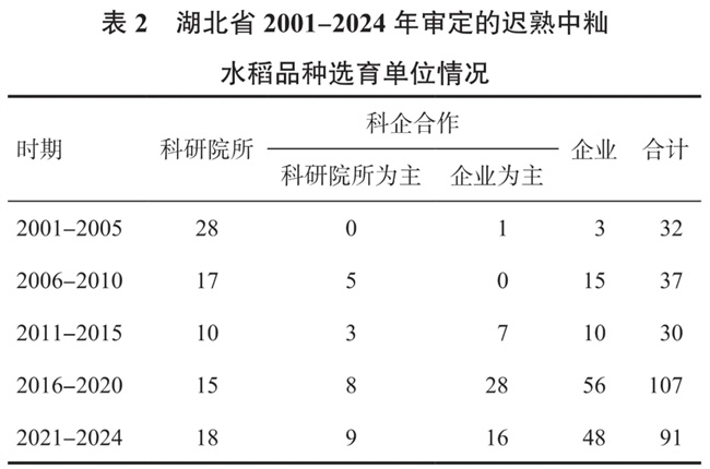 湖北省地處長江中下游,具有良好的農業生態環境和發展優勢,素有“魚米之鄉”的美譽,是全國重要的糧食生產基地之一。水稻是湖北第一大糧食作物,常年種植面積在226萬hm²以上,產量在1850萬t以上,占全省糧食種植面積和總產量的50%和70%,主要以中稻(含一季晚稻)為主,種植面積近200萬hm²,其產量占水稻總產量的90%,遲熟中秈類型品種占據了湖北省水稻生產的主導地位。種子是農業的“芯片”,良種是保障糧食安全和重要農產品有效供給的根基,是確保中國人的飯碗牢牢端在自己手中的關鍵抓手。隨著品種管理制度的完善和育種水平的提升,水稻品種類型不斷豐富,品種數量日益增多,為農業生產提供了更多的選擇。為了解21世紀以來湖北省審定的遲熟中秈水稻品種信息,助力水稻品種培育和產量提升,本文整理了2001-2024年湖北省審定的遲熟中秈水稻品種的相關資料,對其類型、選育單位、主要農藝性狀、米質、稻瘟病抗性等進行分析,以期了解湖北省審定的遲熟中秈水稻品種主要性狀的變化趨勢,為今后湖北省中稻品種的選育和品種管理提供理論參考。