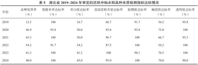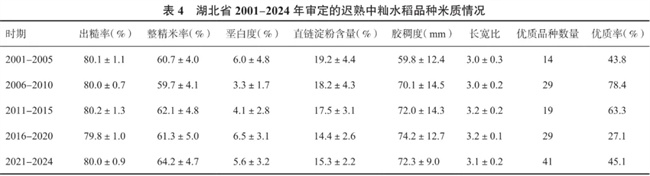 由表4可知,2001-2024年湖北省審定的遲熟中秈水稻品種有132個米質達到國標優質三級或部標三級及以上,占比44.4%;審定品種的優質率以2006-2010年最高,為78.4%,其次是2011-2015年,為63.3%;2016-2020年審定品種的優質率最低,為27.1%,可能是因為2006-2015年審定了多個由廣占63S(含廣占63-4S)、培矮64S配組的品種,品種米質優,提升了湖北省遲熟中秈水稻品種的優質率,并且2016年、2018年的高溫天氣導致當年參試品種米質較差。