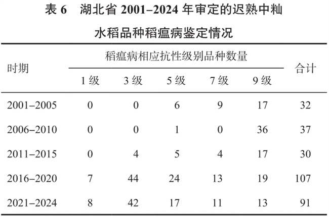稻瘟病是水稻生產的重要病害,由表6可以看出,2001-2010年湖北省審定的遲熟中秈水稻品種稻瘟病抗性級別以9級、7級為主,沒有抗稻瘟病品種通過審定,2011-2015年審定了4個稻瘟病抗性級別為3級的品種,2016-2024年審定了101個稻瘟病抗性級別為1級、3級的品種,占比51%,稻瘟病9級的品種逐漸減少,表明湖北省審定的遲熟中秈水稻品種稻瘟病抗性明顯提高。