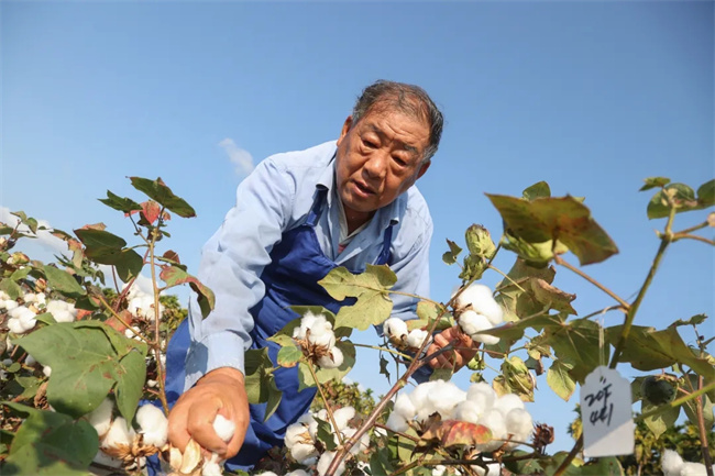 棉花育種專家趙國忠在采摘棉花樣本。