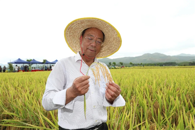 中國科學院院士謝華安在崖州區壩頭南繁公共試驗基地查看稻谷長勢。