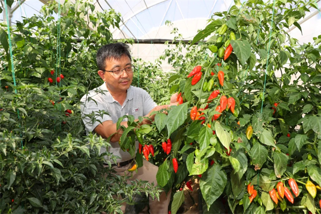 中國農業科學院研究員王立浩在位于崖州區的中國農業科學院國家南繁研究院辣椒種植基地查看辣椒長勢。