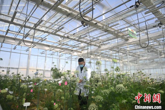 2月19日,甘肅省酒泉市肅州區酒泉芯農研種業科技有限責任公司人工氣候室內,科研人員觀察種子生長開花情況。 李亞龍 攝