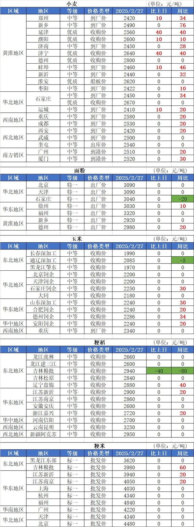 1、2月27日,國內小麥市場總體平穩,局部漲跌。其中,天邦糧油跌5厘,含票價1.24元/斤;菏澤華瑞跌3厘,含票價1.24元/斤;渦陽金沙河漲5厘,含票價1.23元/斤。