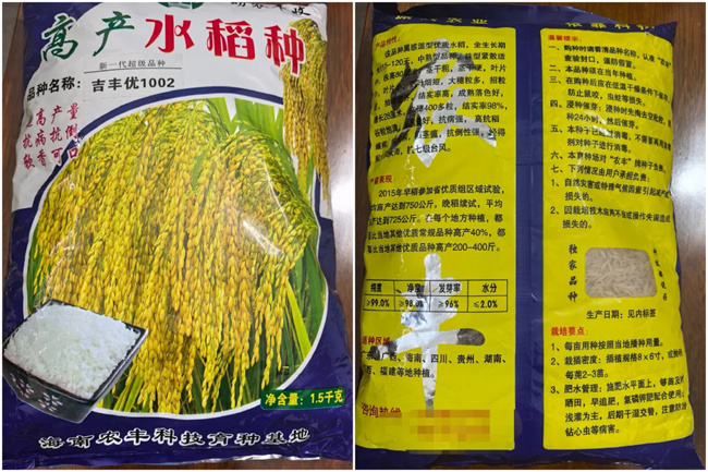 據悉,該犯罪嫌疑人用成本在1元/斤的普通常規稻冒充知名雜交稻種,在網上購入種子包裝袋,自行套包銷售。