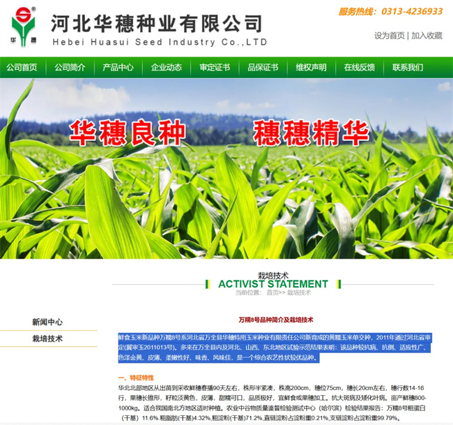 推廣意見(jian)指出,“萬糯8號”適用于鮮食,建議在(zai)河(he)(he)北省春播玉米區春播種(zhong)植(zhi),夏播玉米區夏播種(zhong)植(zhi)。值得注(zhu)意的是(shi),華穗種(zhong)業官網介紹“萬糯8號”時顯示,該(gai)品種(zhong)多年(nian)來(lai)在(zai)萬全縣(xian)內及河(he)(he)北、山(shan)西、東北地區試(shi)驗(yan)示范結果表(biao)明:該(gai)品種(zhong)較抗病(bing)、抗倒、適應性廣、色澤金黃、皮(pi)薄、柔嫩性好、味(wei)香(xiang)、風味(wei)佳,是(shi)一個綜合(he)農藝性狀較優品種(zhong)。