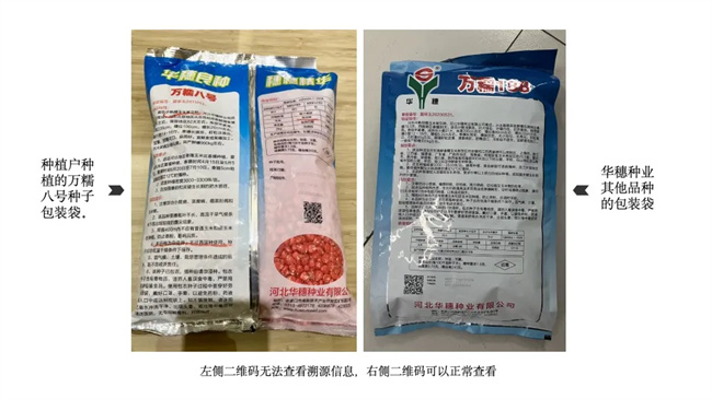 談(tan)話間(jian),華穗種業的銷售人員還拿(na)出公(gong)司的“萬糯188”小袋(dai)種子,溯源碼清(qing)晰可見,掃碼后,產品(pin)信息、溯源信息、品(pin)種詳情一應俱全(quan),但(dan)記者拿(na)到(dao)的“萬糯八號”種子包裝袋(dai)卻掃不出任何信息。