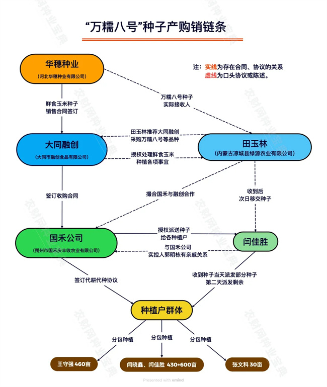 ▲“萬糯八(ba)號”種子產(chan)購銷鏈條。注:實(shi)線為(wei)存在(zai)合(he)同、協議的(de)關系,虛(xu)線為(wei)口頭協議或陳述。