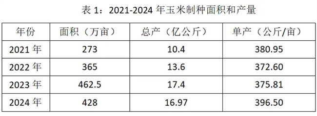 通過對表1分析可知,2021-2024年,全國雜交玉米制種面積走勢起伏,呈現出先增后減的態勢。2021-2023年期間,制種面積逐年遞增,每年大約增加100萬畝,顯示出較為強強勁的增長趨勢。盡管2024年制種面積了35萬畝的縮減,但得益于氣候條件以及種植技術等多方面因素,制種產量與2023年基本保持在相近水平,維持著相對穩定的狀態。
