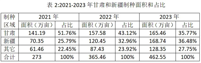 通過對表2的分析能夠清晰發現,在2021-2023年期間,新疆玉米雜交種制種面積呈現出逐年遞增的態勢,其在全國制種面積中的占比也隨之逐年擴大。到2023年,新疆成功超越甘肅,榮登全國玉米制種面積榜首之位。