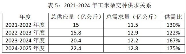 2024-2025年度,玉米雜交種市場呈現出明顯的供大于求態勢,總供應量達22.4億公斤,而總需求量僅為12.8億公斤,剩余庫存高達9.6億公斤。