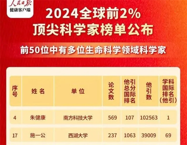 朱健康連續多年入選全球“高被引科學家”名單,是世界自然科學領域發表文章引用率最高的科學家之一,根據斯坦福大學與Elsevier共同發布的第七版《全球前2%頂尖科學家2024》,朱健康位列生命科學全球第一。據統計,截至2024年,朱健康論文引用數量為569個,他引總分為107,他引數為10.25萬,在生命科學領域排名第一。