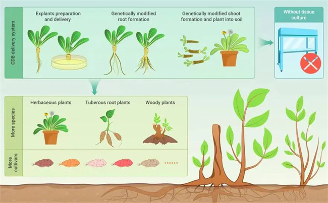 朱健康團隊通過各種方法推升基因編輯技術的應用。去年年初,朱健康團隊發表論文稱,開發出一種極其簡單的植物轉基因及基因組編輯方法,“極度簡化的切割—浸泡—嫁接(ES-CDB)”,用于Taraxacum kok-saghyz(TKS)的植物,通過切割TKS的根部,然后將切口浸泡在含有農桿菌的溶液中,從而實現遺傳轉化和基因編輯。