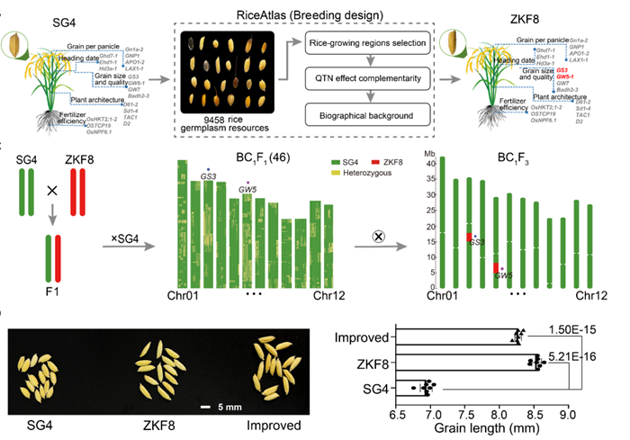 科研團隊對我國五大主要稻區的6044份現代水稻品種進行深度全基因組重測序,結合五大稻區19個鑒定點212組表型數據,系統闡明了不同稻區水稻品種基因組和表型選擇特征,多維度揭示了不同稻區品種適應性以及人文選擇影響。根據以上數據,鑒定到3131個與抽穗期、產量以及逆境響應等關鍵農藝性狀顯著相關的位點,并克隆到水稻粒形調控新基因OsGL3.6。進一步結合已發表數據,完成了近萬份水稻資源、品種的高密度變異圖譜的構建,并開發出在線育種輔助工具,打造了全球最大的水稻資源育種綜合數據平臺——RiceAtlas,科研人員利用該平臺快速改良“綏粳4號”水稻粒形。該項研究為水稻精準設計育種的智能決策提供了重要理論依據和數據支撐。