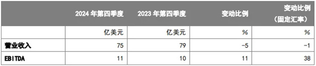 第四季度,先正達集團營業收入75 億美元,同比下降5%(按固定匯率計算下降 1%)。第四季度EBITDA增長11%(按固定匯率計算增長38%)至11億美元。