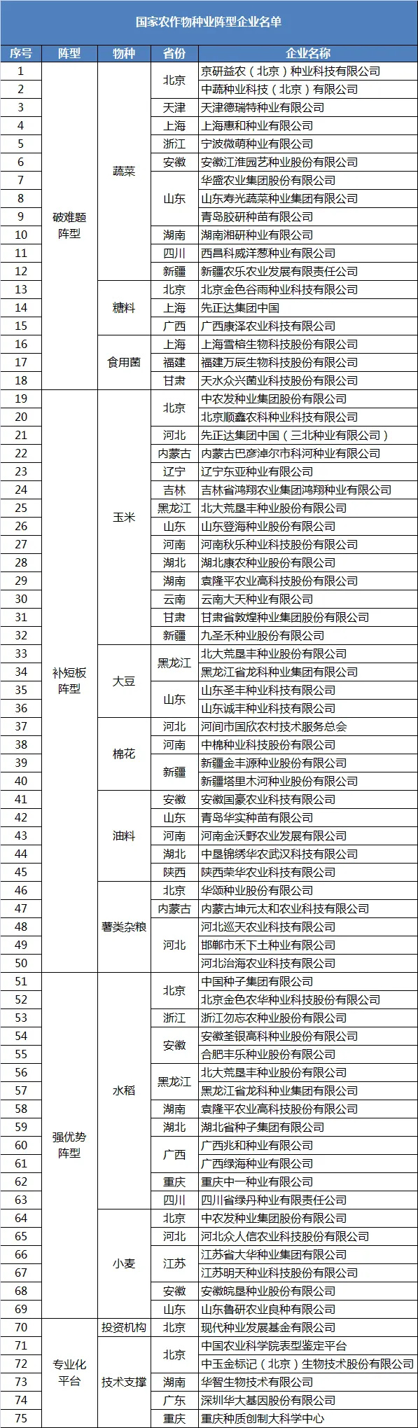 2022年8月13日,農業農村部辦公廳印發《關于扶持國家種業陣型企業發展的通知》(以下簡稱《通知》),根據企業規模、創新能力和發展潛力等關鍵指標,從全國3萬余家種業企業中遴選了69家農作物、86家畜禽、121家水產種業企業機構,集中力量構建“破難題、補短板、強優勢”國家種業企業陣型,加快打造種業振興骨干力量。