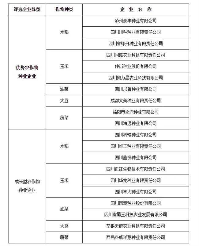 2022年,四川省農業農村廳發布關于四川省農作物優勢種業企業和成長型種業企業評審結果的公示,認定瀘州泰豐種業有限公司等10家企業為四川省優勢農作物種業企業,四川科瑞種業有限公司等10家企業為四川省成長型農作物種業企業。