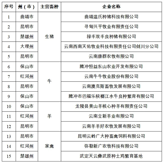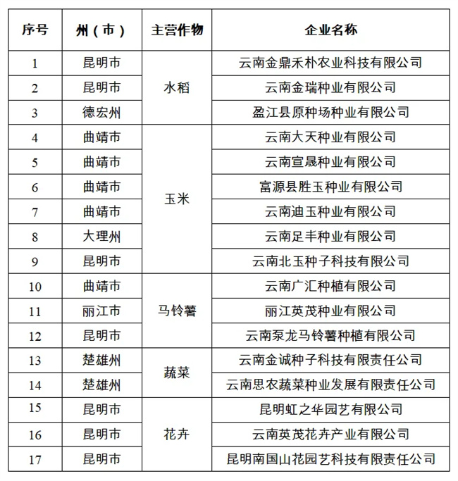 2024年5月,云南省農業農村廳根據企業資產實力、育種研發、創新成果、市場規模等情況,決定遴選云南金鼎禾樸農業科技有限公司等17家企業為省級農作物種業陣型企業;曲靖溫氏種豬科技有限公司等15家企業為省級畜禽種業陣型企業;西雙版納云博水產養殖開發有限公司等10家企業為省級水產種業陣型企業。