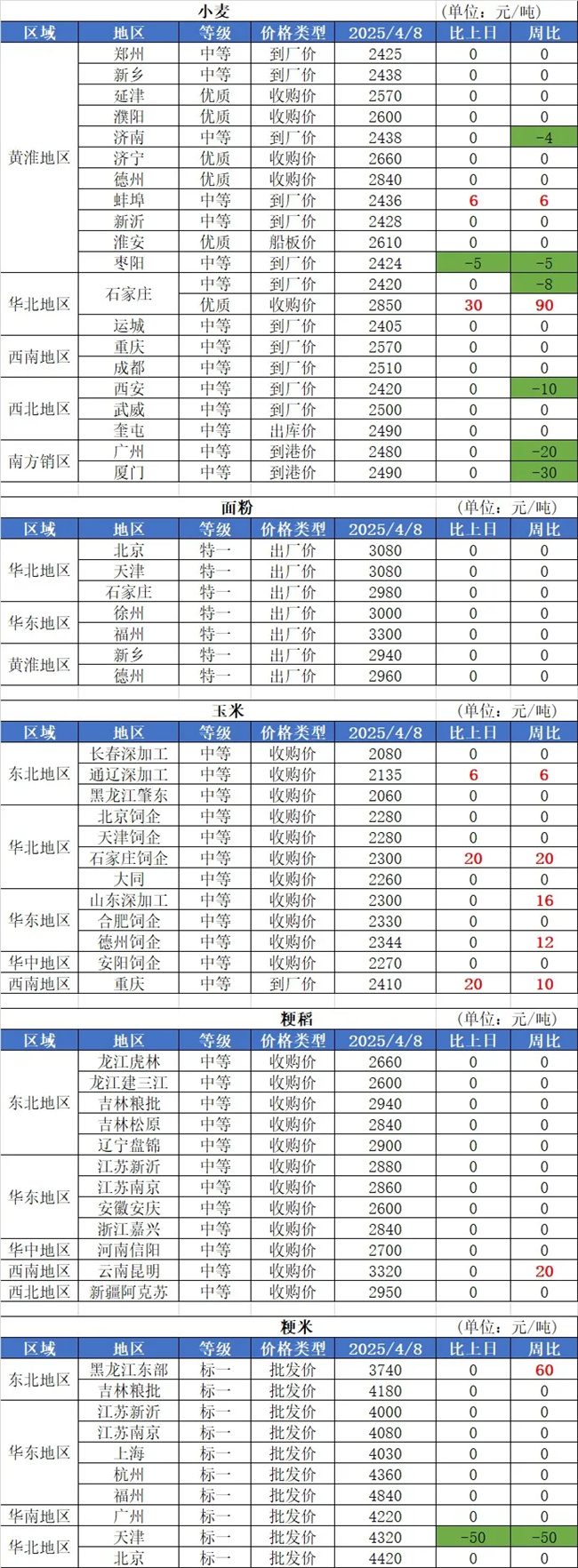 1、4月8日,小麥價格穩中偏弱調整。其中,天邦糧油跌5厘,含票1.212元/斤;雄縣好面緣跌4厘,含票1.21元/斤;周口五得利跌3厘,含票1.217元/斤;渦陽金沙河漲3厘,含票1.218元/斤。