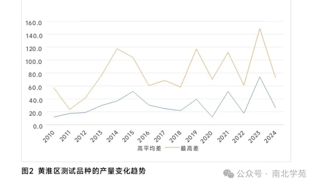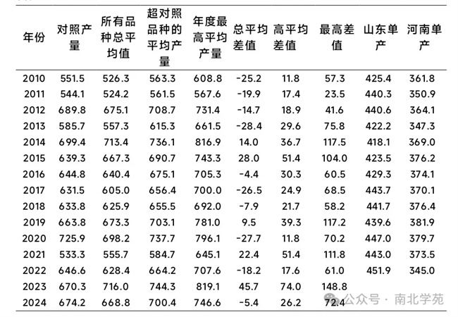 對 2010 年至 2024 年各單位選育的測試組合在 15 年期間的產量變化趨勢進行產量統計(表1),其中表中的高平均差值表示的是所有超過對照的品種的產量平均值與對照產量的差值,最高差值是當年平均產量最高的品種產量與對照產量的差值。