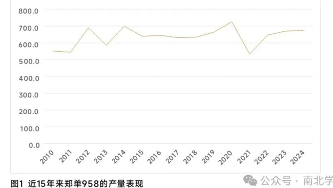從統計來看,對照鄭單 958 在黃淮區年際間產量波動在 533 - 725 公斤/畝左右,波動范圍較大,年際間波動范圍在 90.3--102.3 公斤。近 15 年的平均產量為 635.6 公斤,2020 年鄭單 958 產量是 15 年期間最高的,黃淮區域平均產量為 725.9 公斤,2021 年平均產量低至 533.3 公斤,可能與當年銹病發生較早較重有關。
