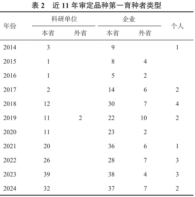 隨著國家“放管服”改革的實行,放寬玉米品種審定渠道,從單一的省級統一試驗,到現在企業聯合體試驗、科企聯合體及綠色通道試驗等,審定渠道的多元化使企業審定玉米品種數量不斷提高,近11年累計占比達63.15%(表2)。2015年企業審定品種數量占比最大,為92.31%,2016年次之,為87.50%。科研單位審定玉米品種數量次之,約33.13%。個人審定玉米品種數量最少,占比3.73%。近11年河南本省的育種單位(或個人)選育并通過審定玉米品種426個,占河南省審定品種88.20%,且呈逐漸增加趨勢。2023年河南省選育并通過審定品種84個,占當年審定玉米品種95%,為近11年之最。外省單位在河南省累計審定品種57個,占比11.80%。外省在河南省審定品種主要以企業為第一育種單位,占比96.49%。2015年外省企業審定玉米品種4個,占當年企業審定品種數量之最,占比33.33%,2019年次之,為31.25%。