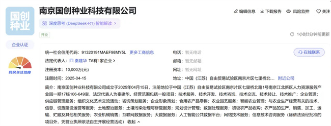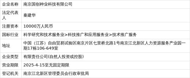 天眼查App顯示,近日,南京國創種業科技有限公司成立,法定代表人為秦建華,注冊資本10000萬人民幣,北京大周國創種業科技有限公司、江蘇紅肩章網絡科技有限公司分別持股51%、49%。
