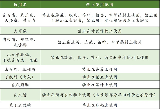 注:氧樂果、克百威、滅多威、涕滅威自2026年6月1日起禁止銷售和使用。溴甲烷可用于“檢疫熏蒸處理”。