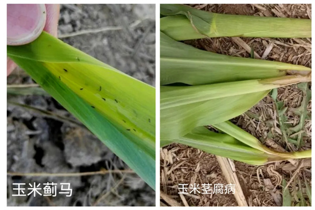 玉米苗期常見病蟲害有蚜蟲、薊馬、莖腐病和根腐病等。可用高效氯氟氰菊酯或甲氨基阿維菌素苯甲酸鹽和噻蟲嗪噴霧防治蚜蟲和薊馬;莖基腐病和根腐病可以用“多菌靈+噻菌銅+惡霉靈”藥劑進行噴霧防治,重點噴發病部位,也可以提前噴施預防,注意及時排澇。