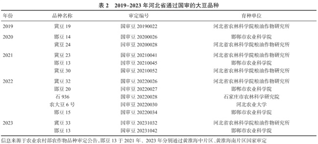 近年來,國家加快推進大豆產業振興,河北省積極響應,著力抓好大豆創新育種,2019-2023年河北省育成國審大(da)豆(dou)(dou)品(pin)(pin)種(zhong)(zhong)(zhong)12個(ge)(ge)(ge)(表(biao)2),省(sheng)審大(da)豆(dou)(dou)品(pin)(pin)種(zhong)(zhong)(zhong)67個(ge)(ge)(ge)。2024年河(he)(he)北省(sheng)主導大(da)豆(dou)(dou)品(pin)(pin)種(zhong)(zhong)(zhong)是冀豆(dou)(dou)17、邯豆(dou)(dou)13和石豆(dou)(dou)8號,這3個(ge)(ge)(ge)品(pin)(pin)種(zhong)(zhong)(zhong)具有高產、穩產、優(you)質、抗(kang)逆、廣適(shi)等特點,適(shi)宜(yi)在河(he)(he)北省(sheng)乃(nai)至(zhi)黃淮海大(da)豆(dou)(dou)產區種(zhong)(zhong)(zhong)植(zhi),豐產性十分突出。同(tong)時河(he)(he)北省(sheng)經(jing)過(guo)大(da)豆(dou)(dou)—玉米帶狀復合種(zhong)(zhong)(zhong)植(zhi)品(pin)(pin)種(zhong)(zhong)(zhong)展(zhan)示(shi)評價(jia)試(shi)驗,篩選出適(shi)宜(yi)帶狀復合種(zhong)(zhong)(zhong)植(zhi)的大(da)豆(dou)(dou)品(pin)(pin)種(zhong)(zhong)(zhong),分別為滄豆(dou)(dou)13、邯豆(dou)(dou)13、石936、冀豆(dou)(dou)1258、邯豆(dou)(dou)15、石豆(dou)(dou)30、冀豆(dou)(dou)12,能夠滿足不同(tong)栽培模式的需要。