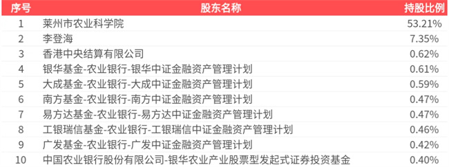 2005年4月,登海種業在深圳證券交易所主板上市,目前公司市值約90億元,股東戶數為7.31萬戶,前十大股東持股數量為5.68億股,占總股本比例為64.59%,前十大股東持股情況如下: