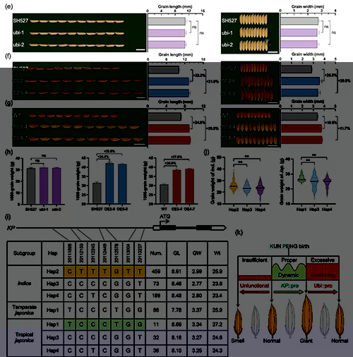 研究人員在秈稻與粳稻中過表達新基因“鯤鵬”,均表現出籽粒粒長、粒寬及千粒重的顯著提高,其中千粒重增幅更是高達30%~40%。相反,該基因敲除后,籽粒大小及千粒重顯著下降,確認了“鯤鵬”在籽粒大小和粒重中的正向調控作用。有趣的是,對粒重的正調控作用僅發生在利用“鯤鵬”內源啟動子對其進行過表達,而組成型啟動子過表達時粒重未改變,表明“鯤鵬”對粒重的正調控作用需要其適當的動態表達,而并非持續性高表達。