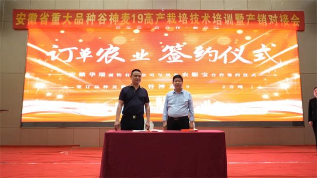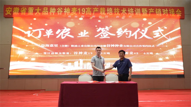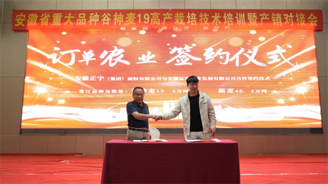 而產銷對接環節更是成果豐碩。會議現場,面粉加工企業、糧貿企業與種植戶、種子經銷商等達成了多項合作協議,完成谷神麥19產銷訂單17萬噸。不僅促進了谷神麥19的市場高效流通,加強了產業鏈上下游的合作。更為谷神麥19的高產優勢和優質特性能夠更好地轉化為經濟效益,實現從田間到餐桌的無縫對接,推動了小麥產業的高質量發展。