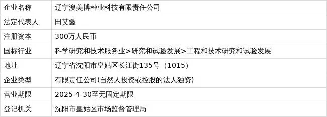 天眼查App顯示,近日,遼寧澳美博種業科技有限責任公司成立,法定代表人為田艾鑫,注冊資本300萬人民幣,由海南靚美種業科技有限公司全資持股。